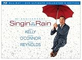 The deluxe box set also includes the movie on DVD, with the same features as the Blu-ray except for the “Jukebox,” and English and Portuguese audio tracks, with subtitles in English, French, Spanish and Portuguese. A third disk carries over the bonus features from the previous DVD including the PBS documentary Musicals Great Musicals (which is a feature-length film), What a Glorious Feeling: The Making of Singin’ in the Rain hosted by Debbie Reynolds, excerpts from the films in which the songs originated (most of the music for Singin’ in the Rain came from Arthur Freed and had been featured in previous musicals), an outtake of the “You Are My Lucky Star” number, a stills slide show, 26 audio tracks of various song takes and unused musical cues from the recording sessions, and an Easter Egg. There’s also a 48-page hard cover book with rare photos, mini reproductions of original lobby door posters, and an umbrella! There is also a single disk Blu-ray edition edition available as well.